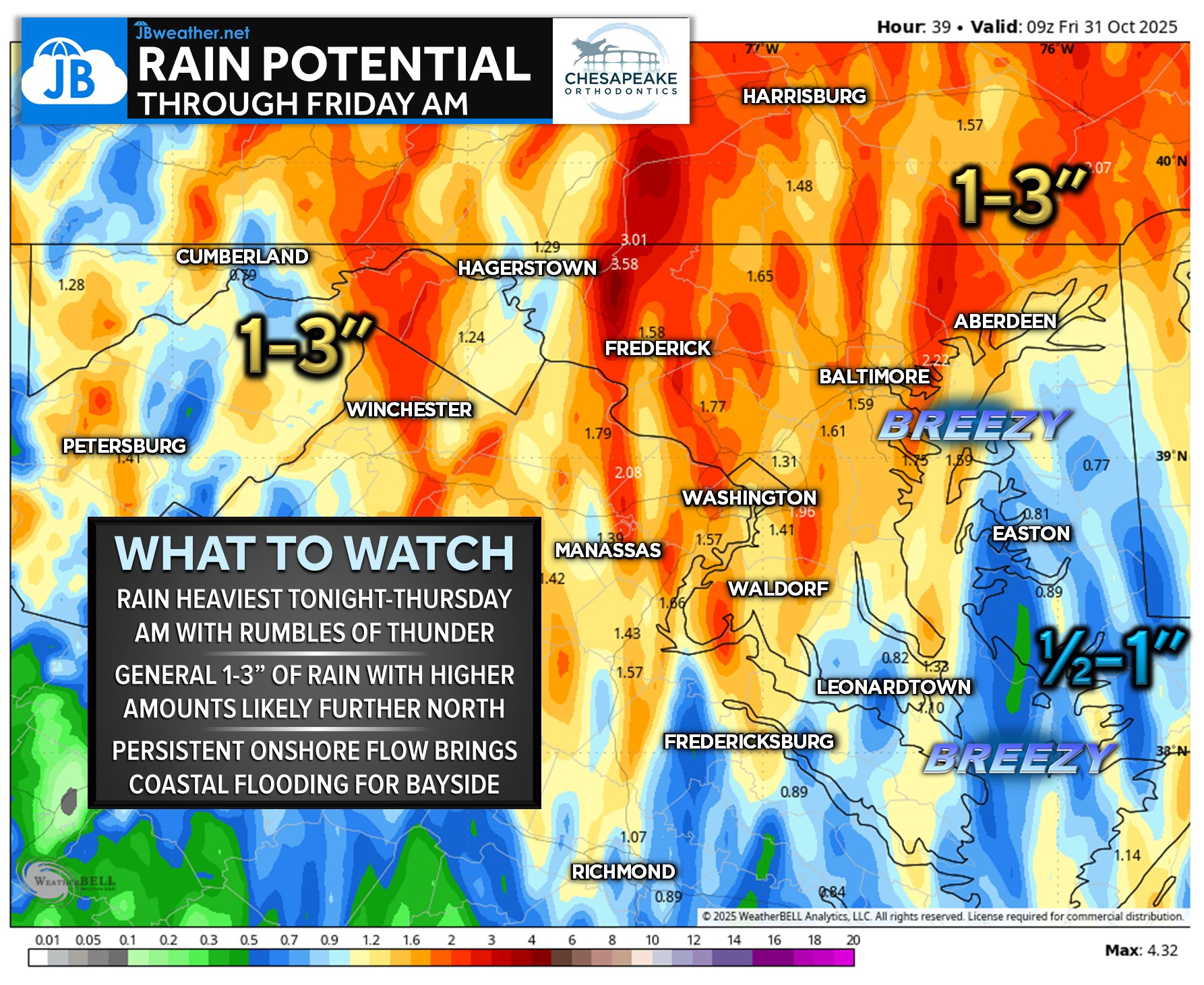 In addition to the rain, a strong onshore flow will set up, pushing water toward the western side of the Chesapeake Bay. This will elevate water levels by 1–2 feet, leading to coastal flooding concerns for Bayside communities. Areas prone to tidal flooding should plan for impacts during high-tide cycles, especially late tonight and Thursday morning. Winds will also turn breezy at times, adding to the unsettled feel of this storm system.