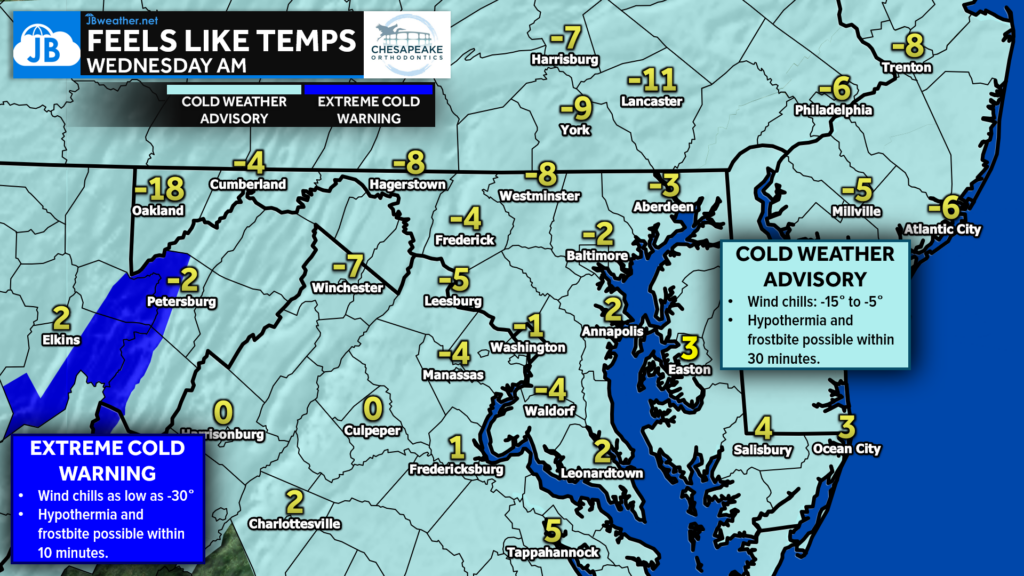 By late tonight into early Wednesday morning, wind chills will fall into the single digits and below zero, with the coldest values west of the mountains. Some areas under an Extreme Cold Warning could see wind chills as low as –20° to –30°, where frostbite can occur in minutes. Even outside of the warning area, exposed skin can be impacted quickly due to persistent winds.