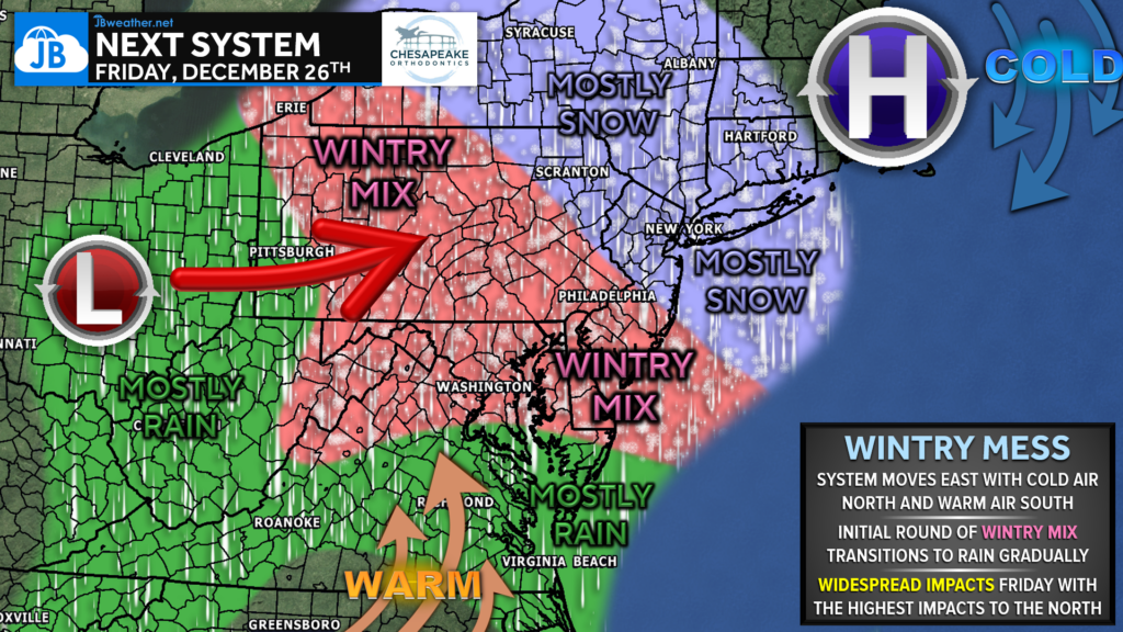 We’re keeping a close eye on our next storm system, which is shaping up to impact the Mid-Atlantic and Northeast the day after Christmas, Friday, December 26th. While there is still time for changes, recent trends have been consistent — and they point toward a much colder and more impactful setup than earlier forecasts suggested.