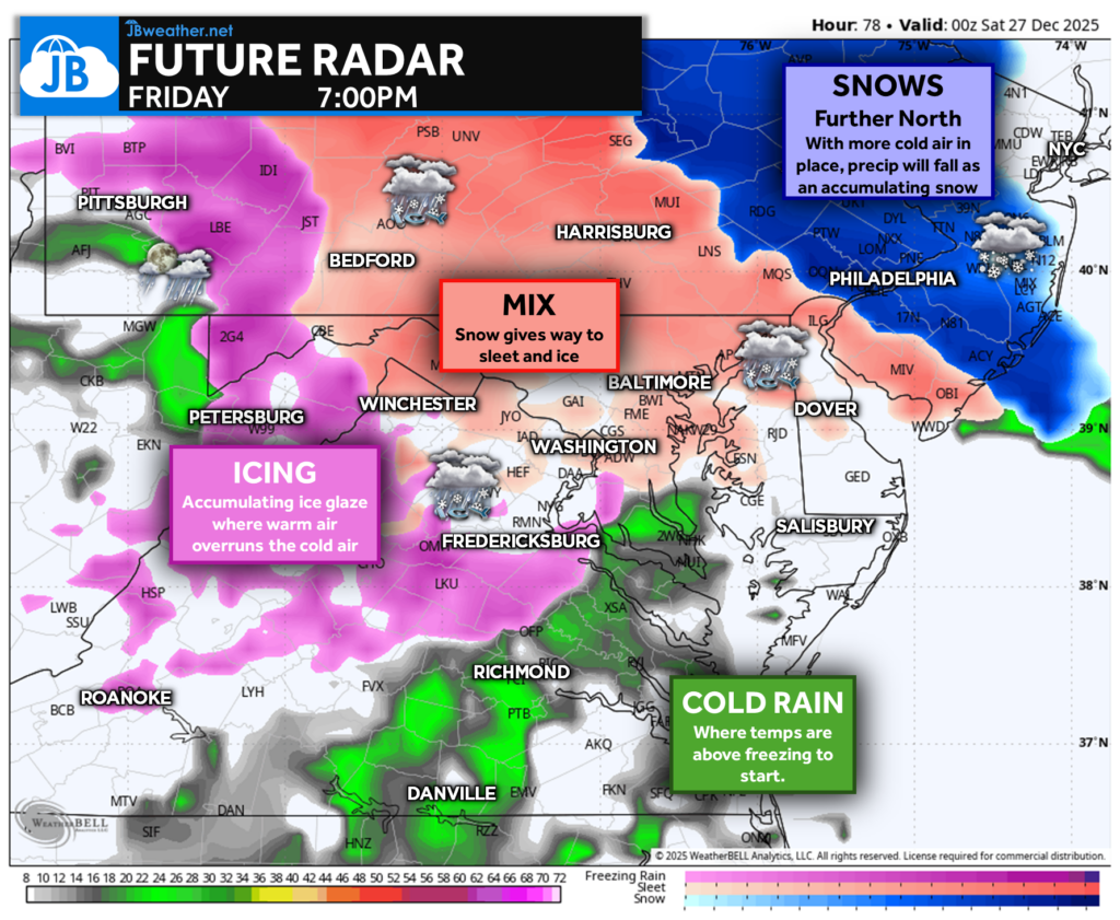 As precipitation overspreads the region on Friday, it will likely start as snow, especially north of Baltimore, where colder air will be more firmly in place. Farther south, snow may quickly transition to sleet and freezing rain before eventually changing to plain rain as warmer air pushes in. The farther north you go, the longer the snow is likely to last, with mostly snow across New England and mostly rain across southern Virginia. While it’s too early to lock in exact totals, areas north of Baltimore are favored to see at least a couple of inches of snow, with lower snow totals but measurable ice accumulation possible across the wintry-mix zone. Given the post-holiday timing, this setup has a high potential to disrupt travel across the Northeast on Friday, making it a system worth watching closely in the days ahead.