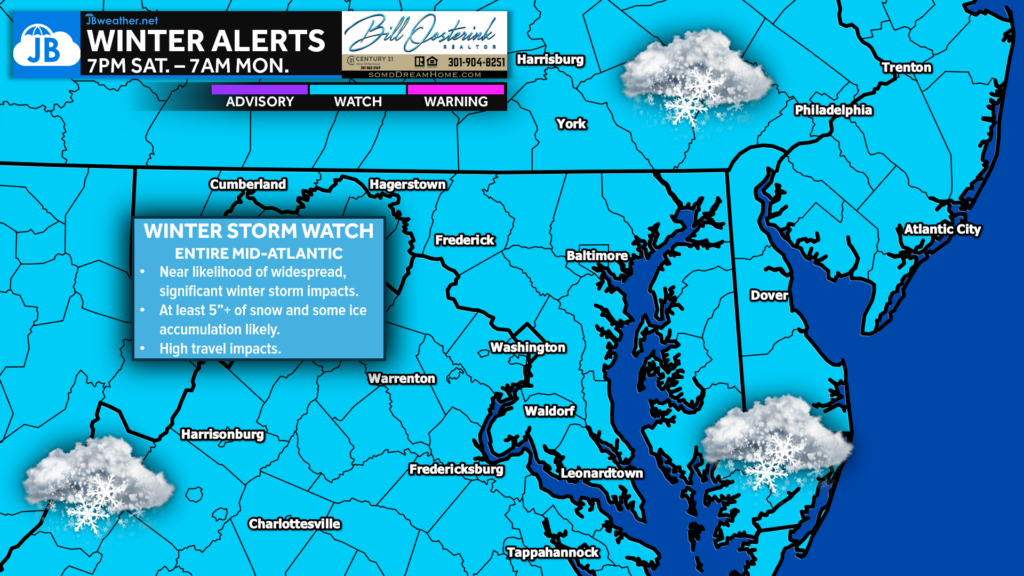 A Winter Storm Watch has been issued for the entire Mid-Atlantic from Saturday evening through Monday morning, signaling a high likelihood of a significant winter storm. Snow may become heavy at times late Saturday night into Sunday, leading to dangerous travel conditions and potential impacts to the Monday morning commute. Very cold air will already be in place, meaning wind chills will be bitter and any snow or ice will linger.