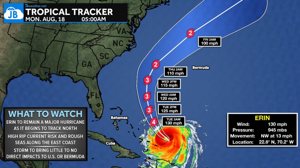 Hurricane Erin has re-intensified into a strong Category 4 hurricane this morning as it churns over the open Atlantic. The storm will maintain major hurricane status over the next couple of days while beginning its long-anticipated turn to the north. This northward bend will position Erin to travel between the U.S. East Coast and Bermuda—well offshore of both.