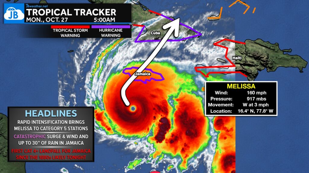 Melissa continues to strengthen as she crawls west-northwest, and the storm is now on track to make landfall in Jamaica tonight into early Tuesday. This will be a catastrophic event for the island, with life-threatening storm surge, destructive winds, and up to 30 inches of rainfall capable of causing widespread flooding and landslides.