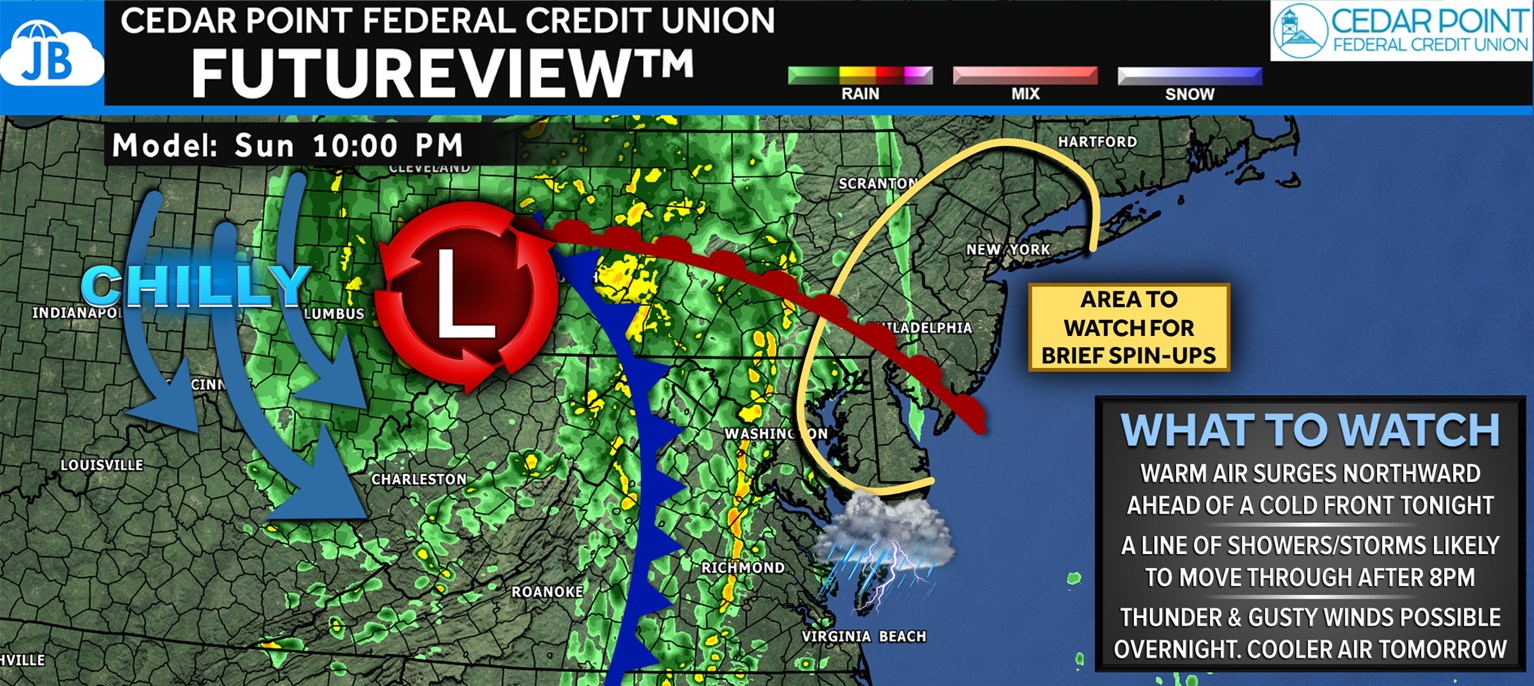 Warm, humid air will surge northward ahead of the boundary, helping to fuel a line of showers and thunderstorms after 8 PM. Some of these storms could produce thunder, brief downpours, and gusty winds, and areas east of the Chesapeake Bay will need to watch for a quick spin-up tornado as the front taps into slightly stronger wind shear. While this is not a widespread severe weather setup, the ingredients are there for a few feisty storms.