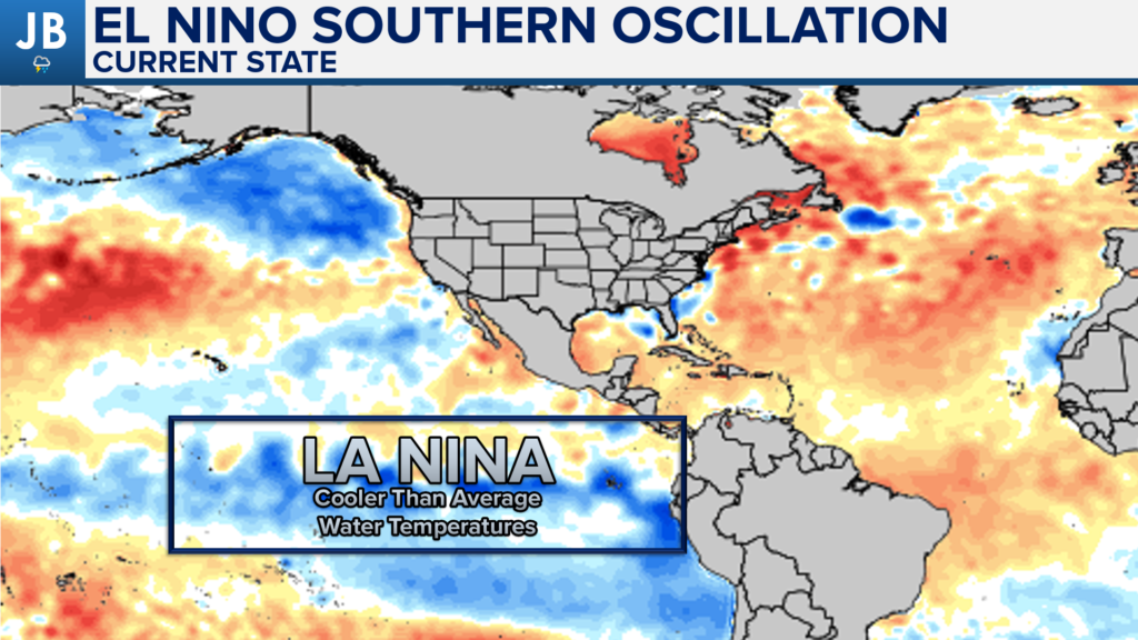 One of the biggest factors for our winters are the water temperatures along the Equatorial Pacific Ocean. These waters off the coast of South America dictate the presence of the southern storm track. We call the waters in this region the “El Nino Southern Oscilation”, or ENSO for short. Water temperatures in the ENSO region have remained below average this year, as they were last year. This means that we still have a La Nina present. This means that the storm track across the Southern US will be less active than in other years.