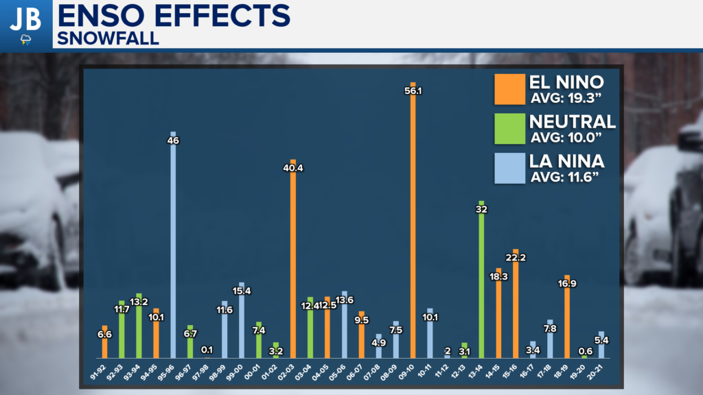 What stands out the most on this chart are the 3 big snow years of 95-96, 02-03, and 09-10. Those years all featured an active storm track with at least 1 blizzard. With the absence of those three winters, our seasonal average falls to just 9.9″. This shows you how much our winter snow totals can rely on one big storm. This chart also shows you how much an El Nino set up can help out our snow totals.