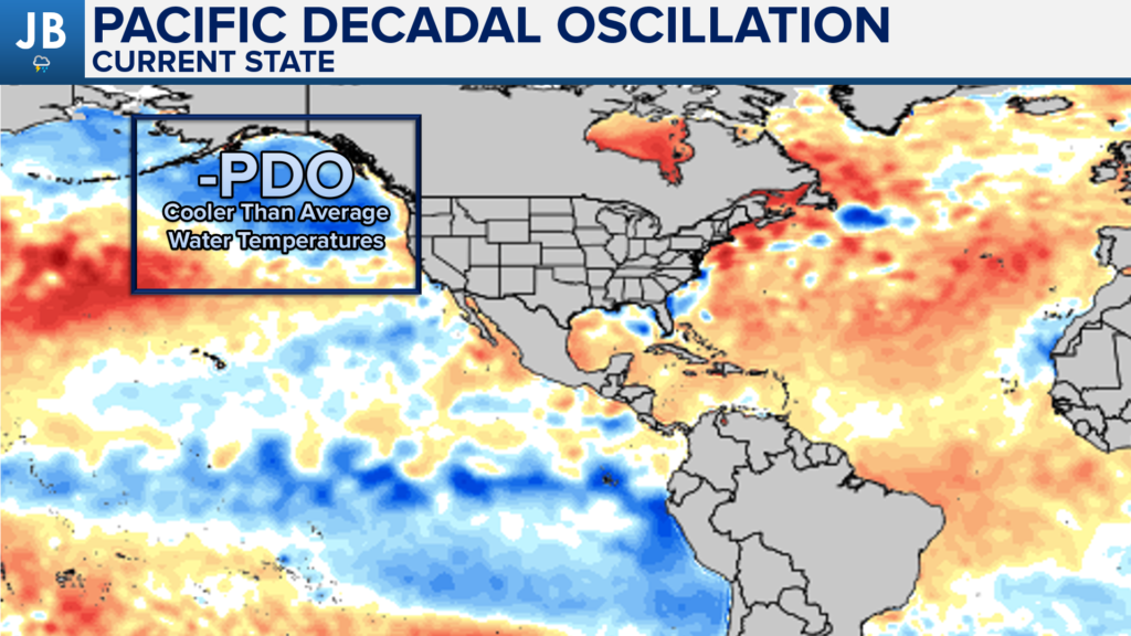 Another region that is important in determining our winter weather is an area of water off the Pacific Northwest coastline. This is referred to as the PDO. We are seeing an abundance of cool water in this region, which means we have a negative PDO. This would work against us seeing patterns that could lead to cold and snow in our region. This is because it develops an area of low pressure over Alaska, funneling the cold air into that region, as opposed to the Eastern US.