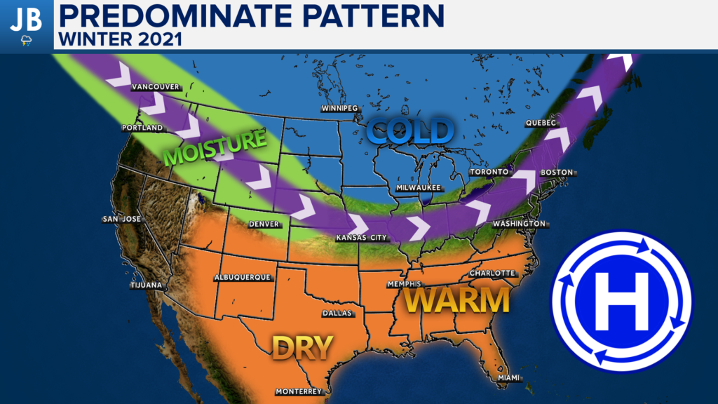 Putting all of these drivers, along with a multitude of other factors, together, I’m able to get an idea of what our predominant weather pattern will look like. I believe that this winter pattern could look a lot like last winter. I think that we will indeed see the Southeast Ridge pump warm air from the south into the Southeast and Mid-Atlantic regions. This will work to keep the Jetstream, shown by the blue line, to the north. This will allow warm air to dominate many areas south of the Jetstream. This does include our region. Areas in the southwest US will likely see a dry winter as well. Most of the cold and snow will be present along the northern tier of the U.S. That Jetstream placement will serve as the primary guide for storms this season. This means that the regions to the north of the storm track will see plenty of precip, including snow. The Jetstream will fluctuate through the season, and the Jetstream will be allowed to drop southward allowing our region to also get in on winter weather. However, I just do not expect that sort of dip in the Jetstream to be a consistent feature.