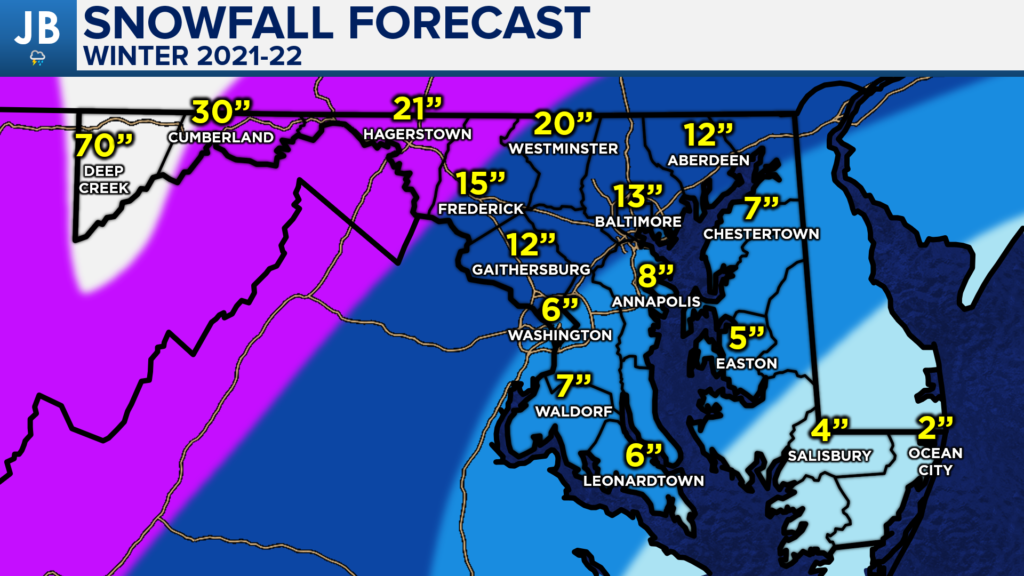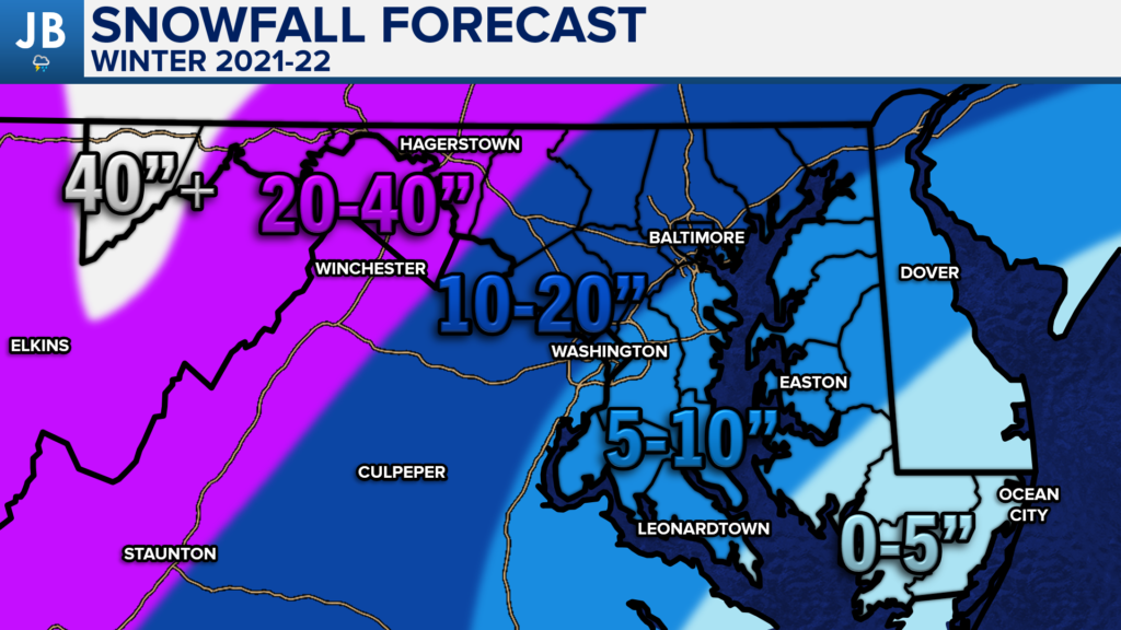 Snowfall totals this winter are likely to be below average across the board, but more snow will likely fall in the typically colder NW DC suburbs. Areas on Delmarva will likely struggle even more than Southern MD to see impressive snow totals. Below is a pinpoint forecast for this winter’s snow totals.
