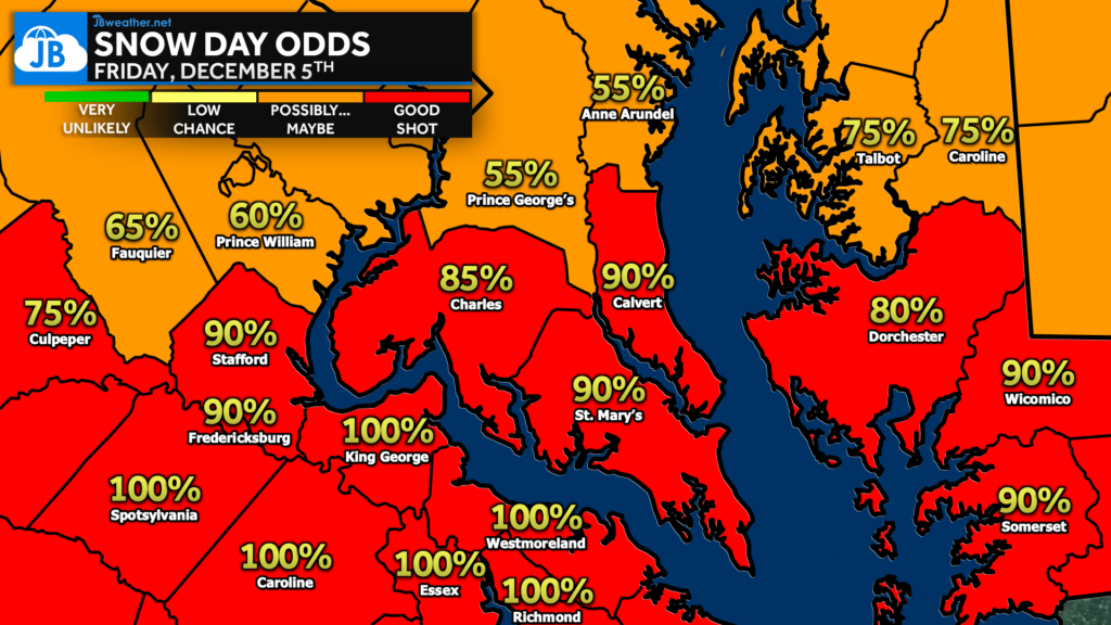 School closures are likely in these areas, with delays possible across the D.C. metro depending on how far north the steadier snow reaches. For Baltimore and points north, impacts remain minimal outside of isolated slick spots.