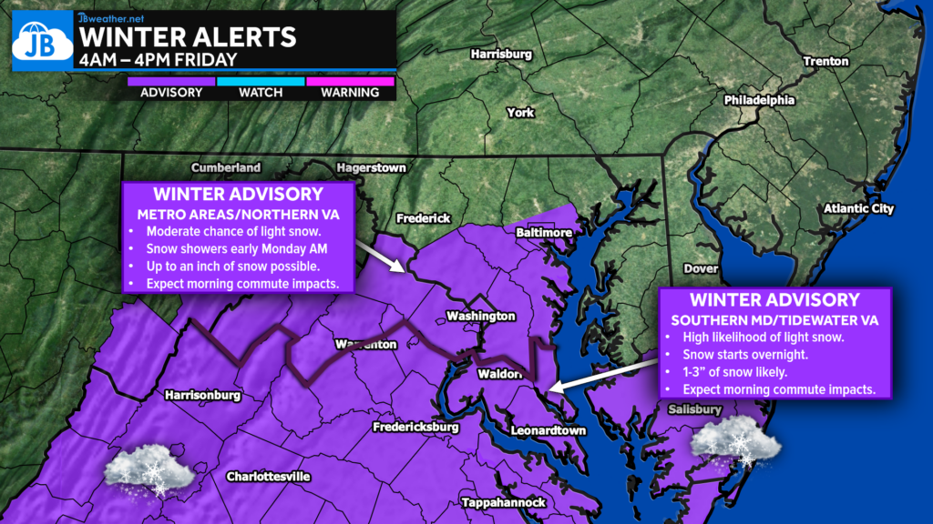 Our forecast has trended upward today as confidence increases in a light but widespread snowfall across the region Friday. A faster and slightly farther-north storm track now supports 1–3 inches of snow for most areas south of Route 50, with lighter amounts north. Winter Weather Advisories are already posted for much of the region, including Southern Maryland.