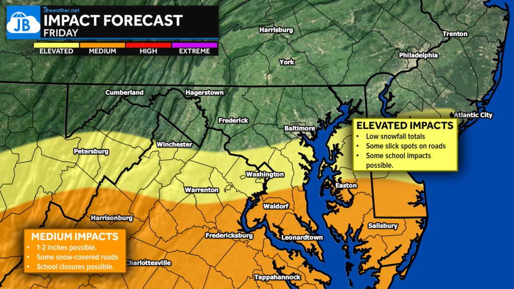 This is a low-to-moderate impact event, with the highest impacts concentrated south of Route 50. The cold air locked in overhead will allow snow to accumulate quickly on untreated surfaces, resulting in snow-covered roads by sunrise. Travel will be slow and slippery Friday morning across Southern Maryland and central Virginia.