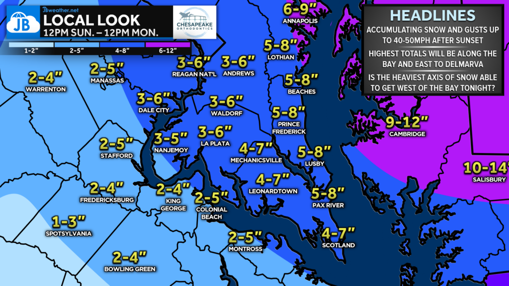 Those along the Bay have the best regional shot at seeing at least 6 inches. Coastal Delmarva and coastal New Jersey could approach two feet where the heaviest bands persist. Philadelphia remains in a boom zone where totals could climb into the 12–18 inch range if the storm tracks favorably.