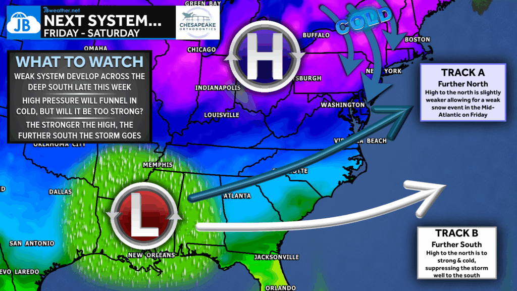 A strong high to the north will deliver plenty of cold air, creating a favorable thermal environment for snow. However, this same high also dries out the atmosphere and acts as a barrier to keep the storm suppressed to the south. Without a ridge building along the West Coast, this system never has the push it needs to come farther north, which limits how significant the event can become in our region. Even so, the storm may sneak just far enough north to bring light snow to portions of the southern Mid-Atlantic.