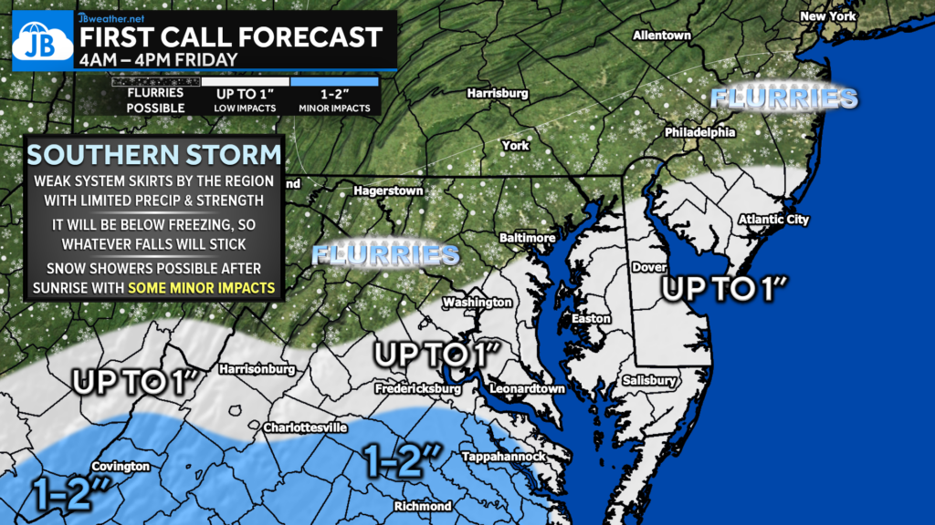 As for snowfall amounts, the highest confidence is across central Virginia, where 1–2 inches remain possible from the Richmond to Tappahannock corridor. For areas south of Route 50, including Southern Maryland, the lower Eastern Shore, and Tidewater Virginia, totals of up to 1 inch are possible—mainly depending on how far the moisture can push north. Farther north, toward the Baltimore–Philadelphia corridor, only flurries or trace amounts are expected.