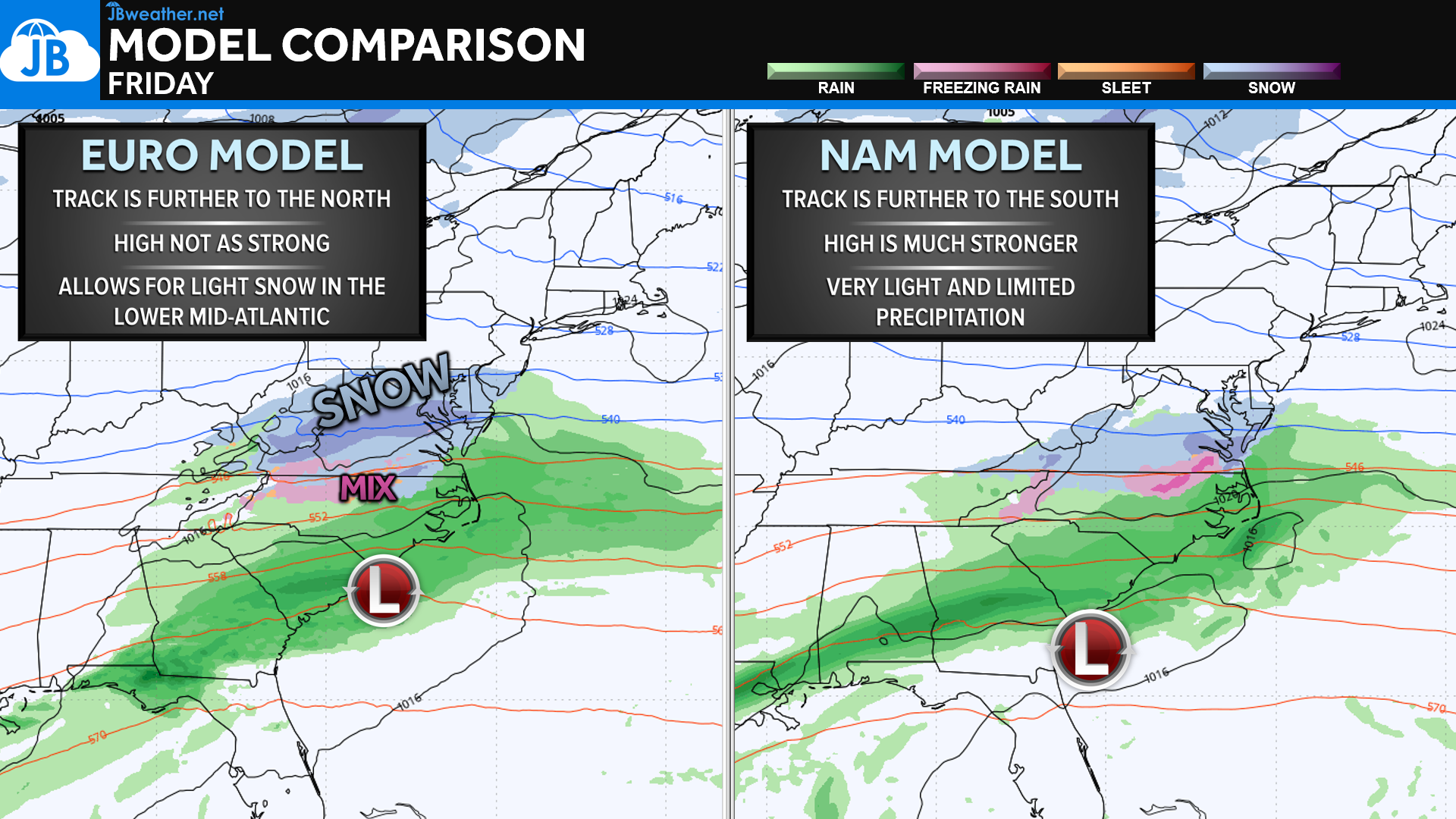 This remains a highly uncertain setup, and the ultimate track will depend on how quickly and how strongly the high to the north develops. A shift of just 50 miles in the moisture field would change totals meaningfully for our region. For now, expect a very minor system overall, but one that could bring the first accumulating snowfall of the season to our southern zones. Stay with JB Weather for the latest information on impacts here in Southern Maryland and across the Mid-Atlantic. You can always access my forecasts and updates here on the website, on Facebook, on Twitter, on Instagram, and on YouTube. JB Weather is the Mid-Atlantic’s Weather Leader, and I am working around the clock to keep you ahead of any storm!