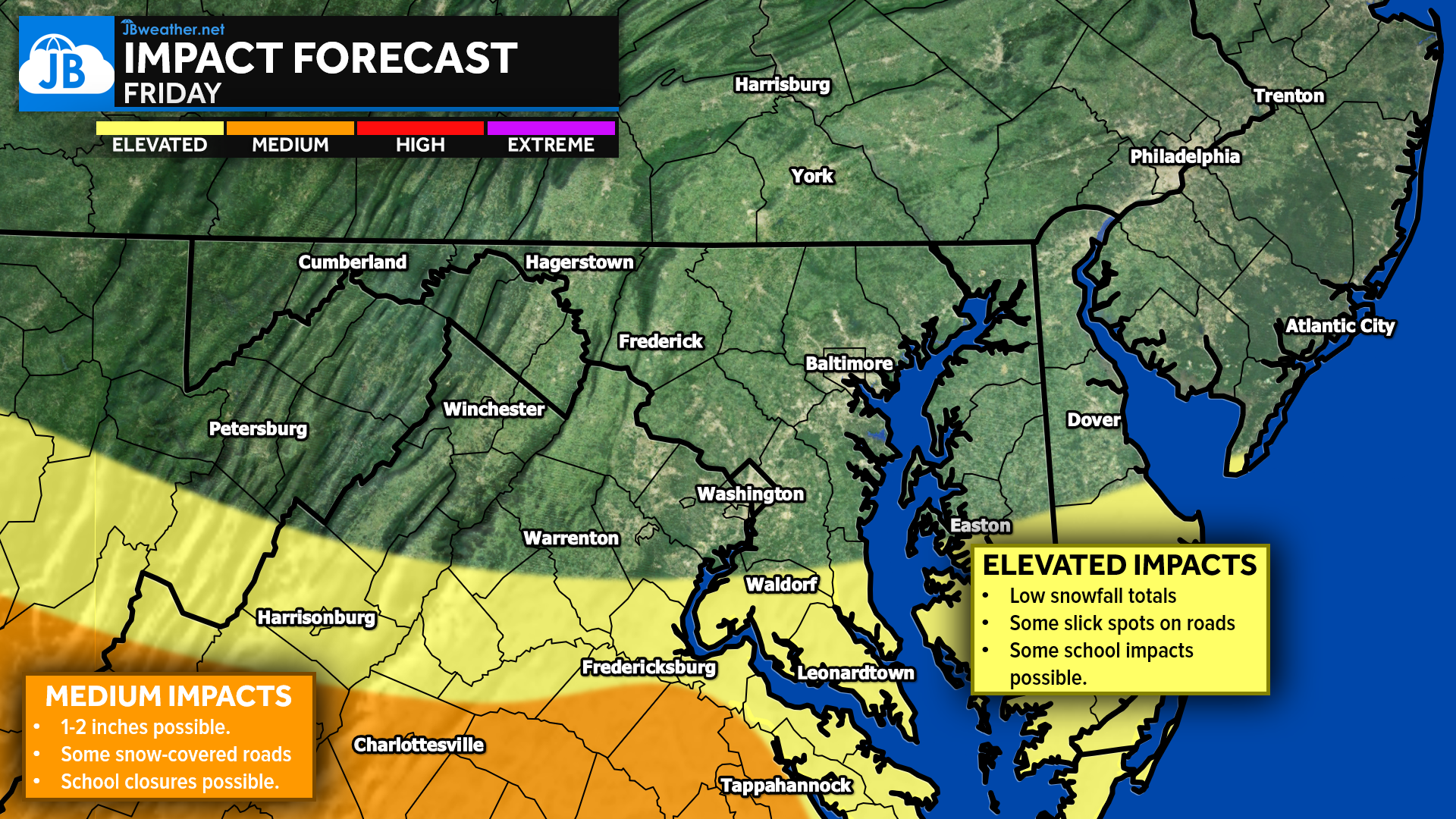 Impacts will be driven more by timing and temperatures than by snowfall amounts. It’s too early to speak confidently about school delays or closures, but given the cold surface temps, early-morning timing, and the potential for light accumulation, they will at least be in play. This is not a high-impact storm, but it’s enough to cause some disruptions—especially south of Route 50.