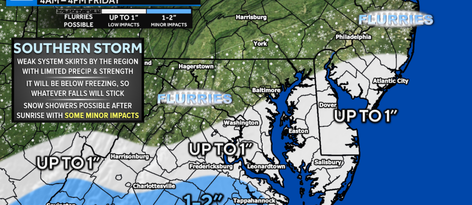 Model disagreement continues, but the potential remains for light snow south of Route 50 for Friday.