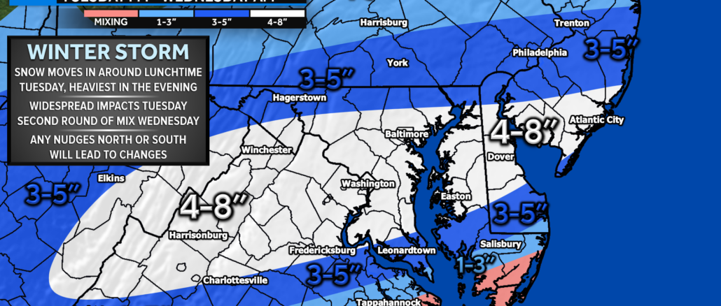 A winter storm will look to bring widespread impacts on Tuesday with as much as 4-8″ of snow accumulation being likely.