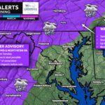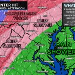 As precipitation moves in around sunrise, many locations northwest of I-95 should start as snow, while areas southeast of the interstate begin as rain. Through the late morning and early afternoon, slightly warmer air will push the rain–snow line steadily northwest. This will turn snow to a wintry mix for central Maryland and eventually over to all rain by midday near and along I-95. Meanwhile, northern Maryland, southern Pennsylvania, and western Maryland are most likely to remain primarily snow throughout the storm.