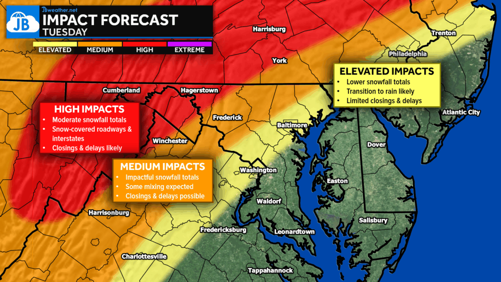 The early timing means the morning commute could be impacted across colder northwest regions, with slick roads and reduced visibility possible. School or business delays and closures are possible north and west of I-95, especially closer to the Pennsylvania line, though it is still a bit early for specific school-odds forecasts. Travel impacts will be far lower near and southeast of the major cities where rain quickly becomes dominant.