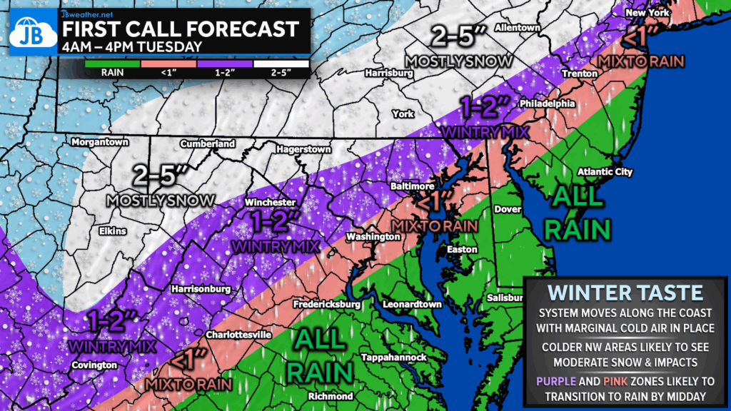 A coastal storm will bring our first true wintry weather threat of the season on Tuesday. With marginal cold air in place at sunrise, many areas along and northwest of I-95 may begin as snow before warmer air gradually moves in. As is typical for early December, this system will favor the colder, inland zones.