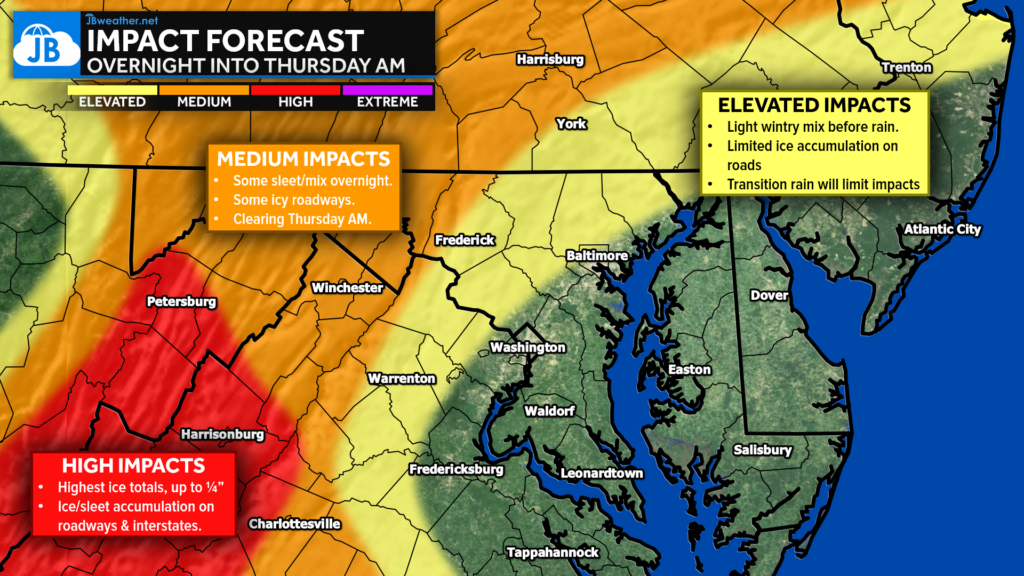 Impacts overnight will be the highest west of I-95, where icy roadways will be possible. A transition to rain will help to minimize those impacts Thursday morning, but slick travel conditions will be possible, especially northwest of I-95. School closures and delays are possible thanks to both Tuesday’s winter storm and tonight’s wintry mix. I would bank on widespread delays, with a few closures being possible. I will have my school odds published this afternoon after I get home from teaching!