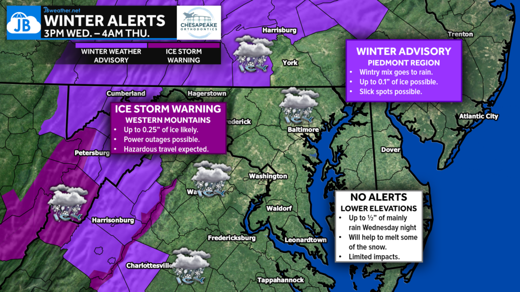 Ice Storm Warnings have been issued for the coldest spots west of I-95 where the highest amounts of ice are likely to be found. The Piedmont region and Southern PA is under a Winter Weather Advisory (light purple) where measurable ice and sleet are possible. These alerts run from 3PM Wednesday until 4PM Thursday.