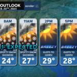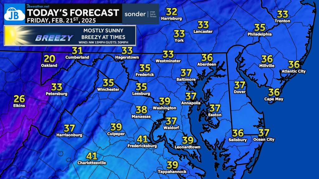 We have a seasonally cool day on tap, with many spots only maxing out in the 30s. The bigger story today will be the winds! Northwesterly breezes will gust up to 30mph with sustained wind speeds around 15mph. This will definitely make it feel 5-10° cooler out there.