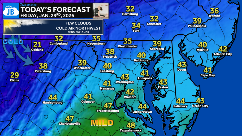 Temperatures today will make a push toward seasonal averages, with highs reaching the upper 30s to low 40s for many areas under a mix of sun and clouds. Winds remain out of the northwest, keeping a cool feel in place despite the modest afternoon warm-up. Colder air remains bottled up just west of the mountains for now, but that will begin to spill eastward later this evening. As that colder air arrives, temperatures will fall quickly after sunset, especially for locations closer to and west of the Blue Ridge. Overall, today serves as a brief transition before sharper cold settles in tonight.