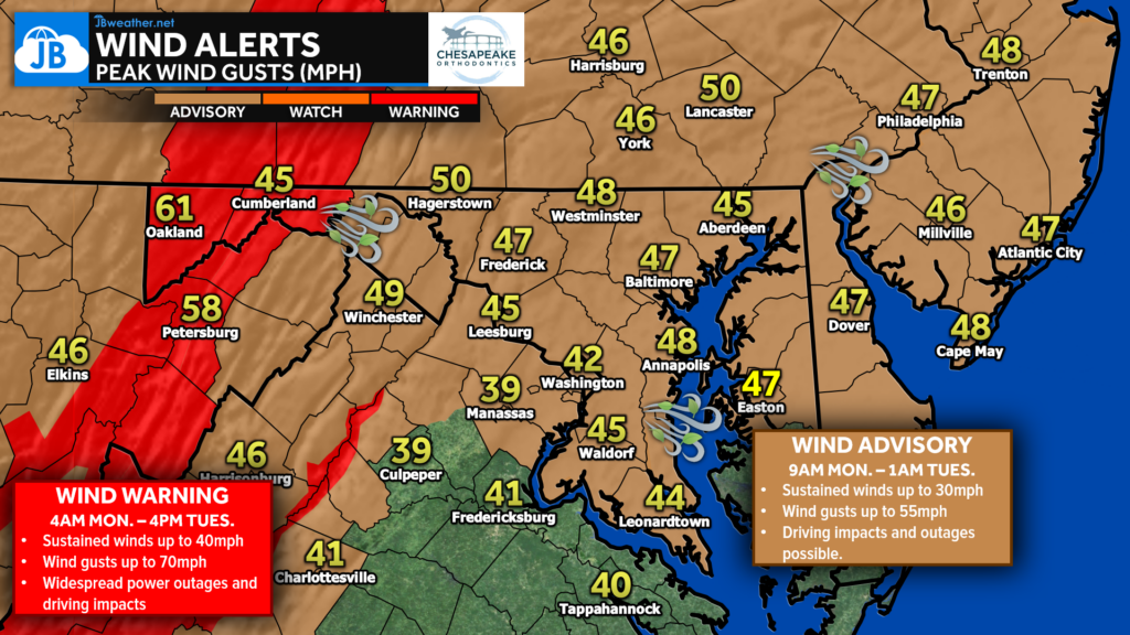 A strong cold front moving through tonight will usher in a period of very gusty winds across the region. Newly issued Wind Advisories and Wind Warnings highlight the potential for travel issues, downed trees, and scattered power outages through Monday into early Tuesday.