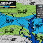 Overnight into Wednesday morning, the focus of the rain shifts southeast as the system pivots. Areas along the coastal plain, including Southern Maryland, the Northern Neck, and the Delmarva, may see their steadiest rain between 4 AM and 10 AM Wednesday, with totals up to a third of an inch. Rain gradually tapers from west to east, clearing the region around midday as cooler, drier air filters in behind the departing system.