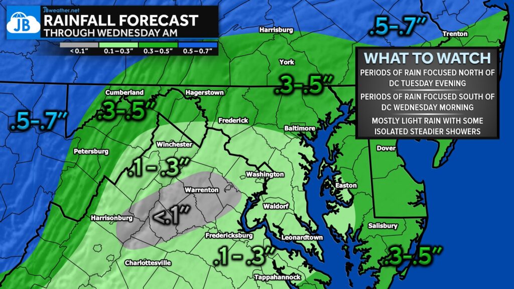 Light Rainfall Tuesday–Wednesday: Highest Totals North of DC