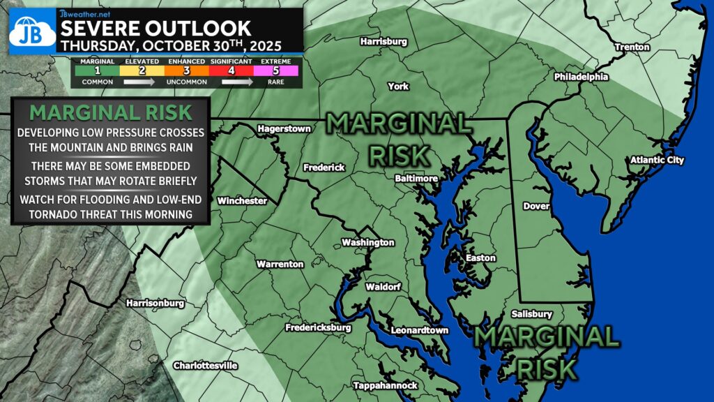 As this next wave of rain moves onshore, a few embedded thunderstorms may develop. Most storms will be non-severe, but the environment does support a low-end tornado threat, especially near any stronger cells that can briefly rotate. Ponding of water on roads and localized flooding in poor drainage areas is also something to watch, given last night’s rainfall. The Storm Prediction Center has placed our region under a Level 1 – Marginal Risk for severe weather, meaning isolated issues are possible but widespread severe weather is not expected.