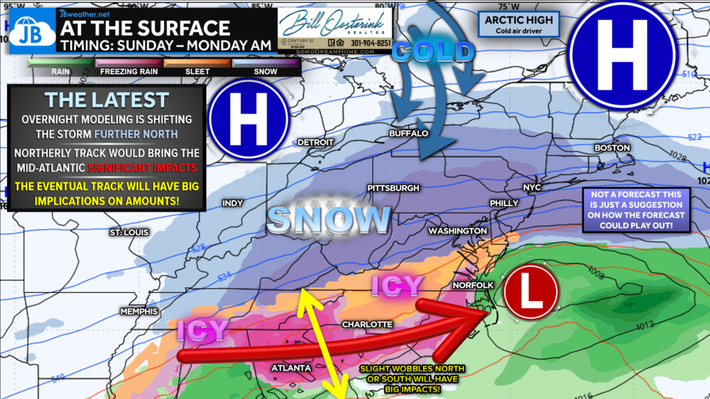Overnight and early-morning modeling has begun to shift the storm track slightly farther north. If this trend continues, it would increase the potential for more significant winter weather impacts across the Mid-Atlantic, as the storm would interact more directly with cold air supplied by a strong Arctic high to the north. At this range — still 4–5 days out — these solutions are far from locked in, but a northward shift is a meaningful signal that forecasters will continue to monitor closely.
