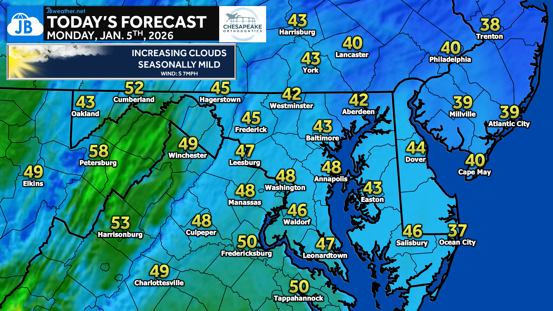 After a cold start to the new year, conditions turn a bit more mild today across the region. Increasing clouds move in, but temperatures rebound into the 40s and low 50s, making for a seasonally mild January afternoon. Winds stay light, allowing for a quiet start to the workweek!