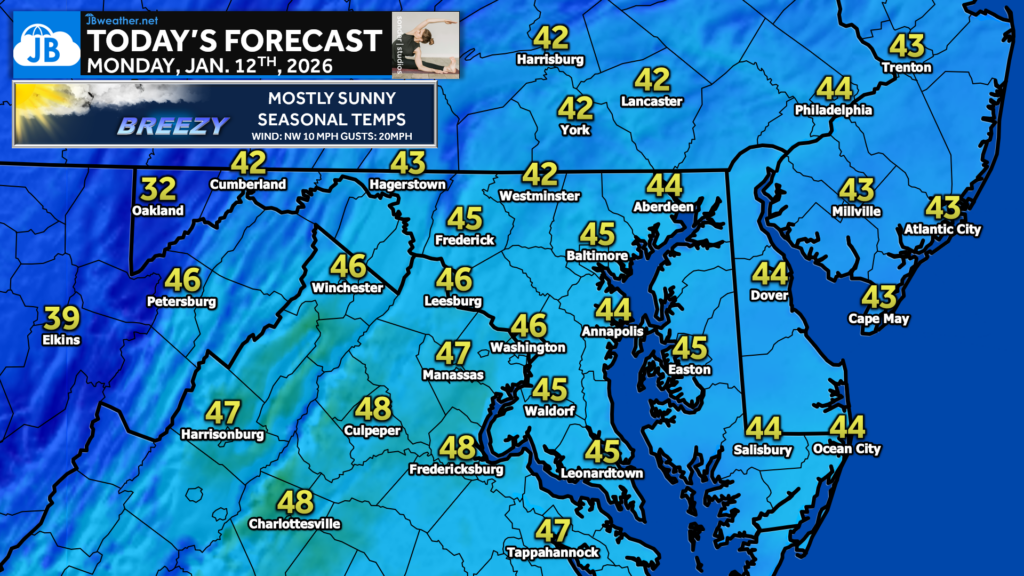 A mostly sunny and breezy Monday is on tap across the region with seasonable January temperatures. Highs will reach the low to mid-40s for most spots, with a few upper 40s south and west of I-95. Northwest winds will add a bit of a chill at times, especially this morning. Overall, a bright but brisk start to the week.