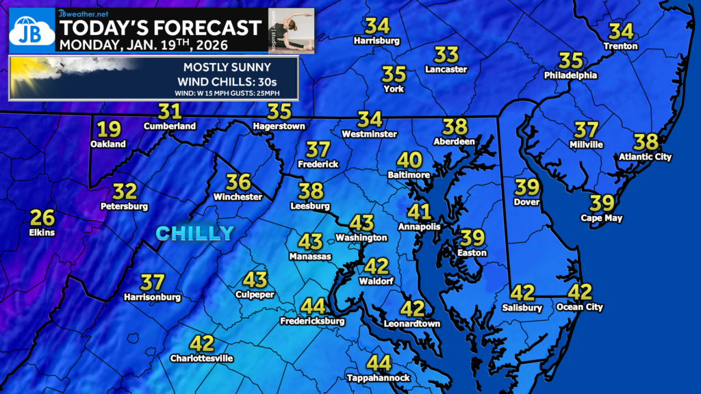 Mostly sunny skies dominate today, but don’t let the sunshine fool you! It will be a chilly one across the region. Afternoon highs range from the low 30s north to low–mid 40s south. West winds gusting up to 25 mph at times will keep wind chills in the 30s. It’ll feel crisp from start to finish, especially this morning. Bundle up if you’re heading out, but enjoy the quiet weather while it lasts.