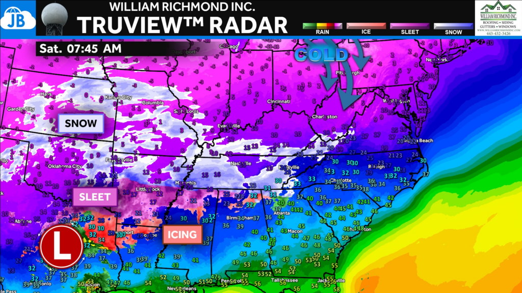 Current radar imagery shows a large, well-organized storm system stretching across the central United States, with widespread snow on its cold side and a broad zone of sleet and icing developing to the south. Strong high pressure to our north is supplying cold air, ensuring that precipitation will begin as snow everywhere once it arrives late tonight into early Sunday. This cold air is locked in initially, setting the stage for a heavy thump of snow before any changeover occurs.