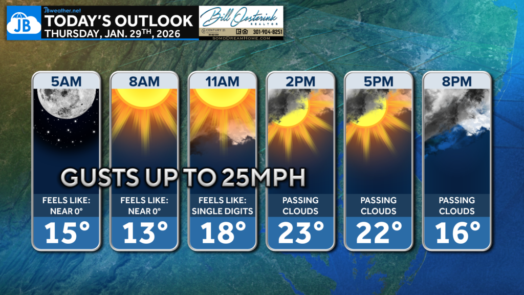Temperatures start the morning in the teens with wind chills near zero, and gusty winds up to 25 mph will keep it feeling brutally cold all day. After some early sunshine, passing clouds move through this afternoon, but highs will struggle to climb out of the low 20s. Wind chills remain in the single digits to teens for much of the day, so bundle up if you’re heading out.