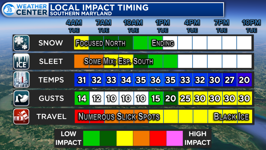 Travel impacts are likely to linger throughout the day. The highest impacts will be felt up across the Baltimore area with snow will hang on through lunchtime. Much of our region will see medium impacts with residual slick spots on area roads and highways. You will want ot take it slow!