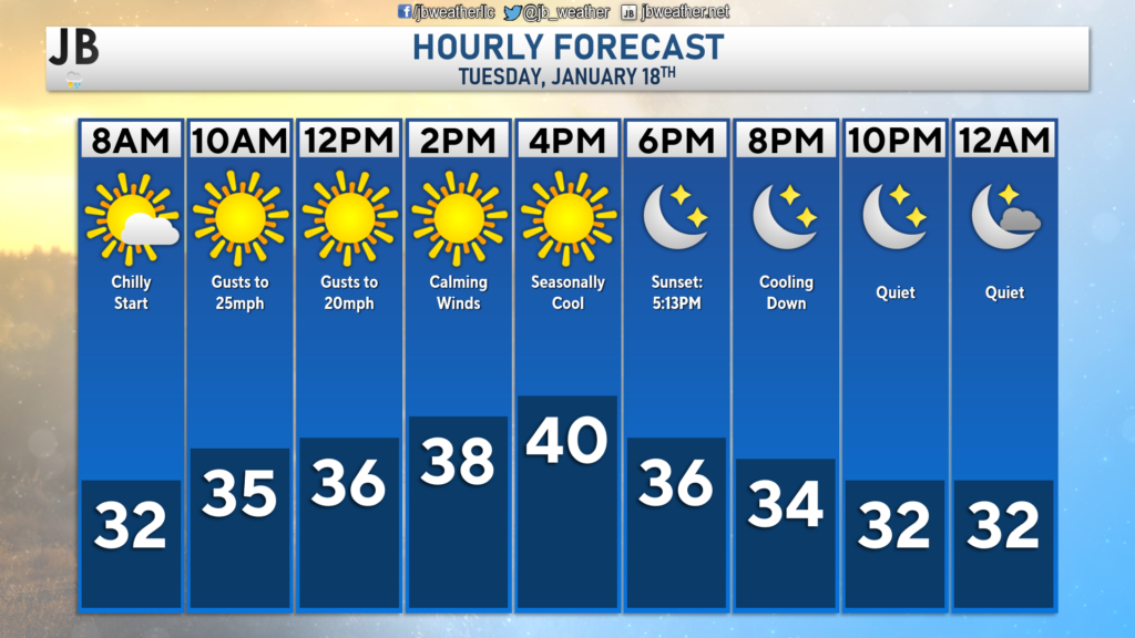 1We are off to a chilly start this morning with temperatures in the upper 20s and lower 30s areawide! Some slick spots are possible as a result of the freezing temps, so do keep that in mind as you head out this morning. All-in-all though, today looks like a rather seasonal day for mid-January.