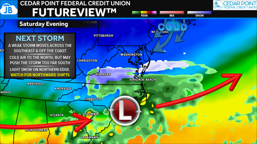 A weak storm system will pass to our south Saturday evening. Something to watch is that this may track just far enough north to bring a period of light snow to southern Maryland and the Northern Neck. At this time, this does not look like a significant event, with limited accumulation expected due to the southern track and weaker system strength.