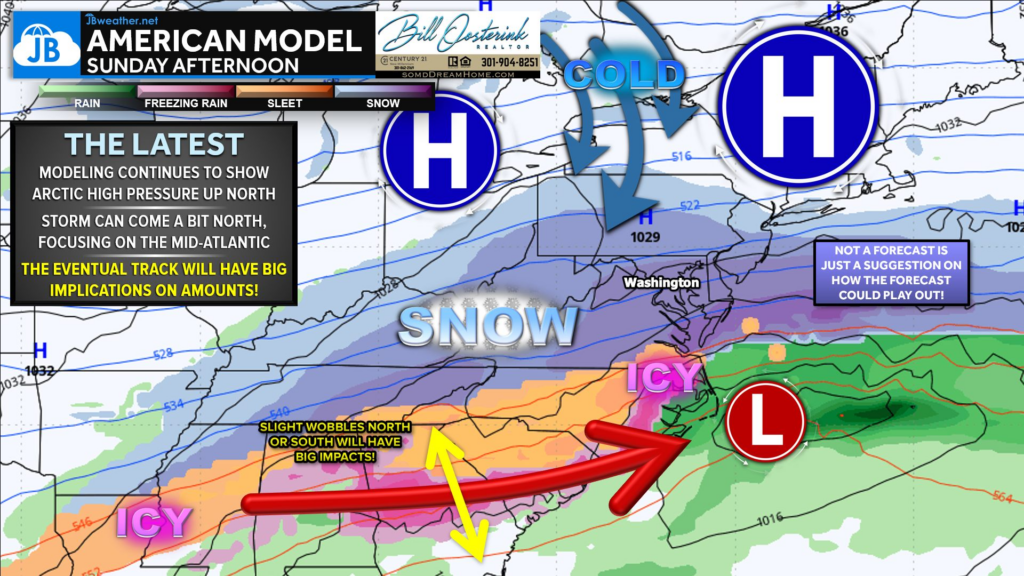 Good morning! Forecast modeling continues to highlight the potential for a winter storm this weekend, though there are still key disagreements on the exact placement of arctic high pressure to the north and the eventual storm track. Those details will play a major role in precipitation type, impacts, and amounts across the region.
